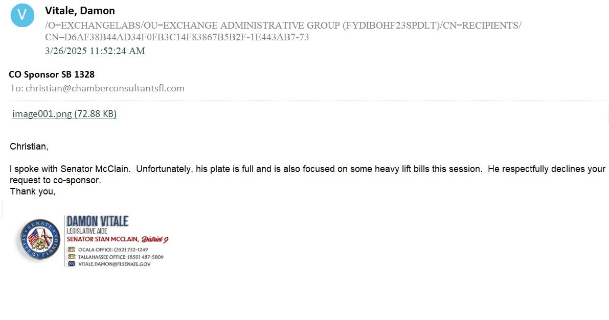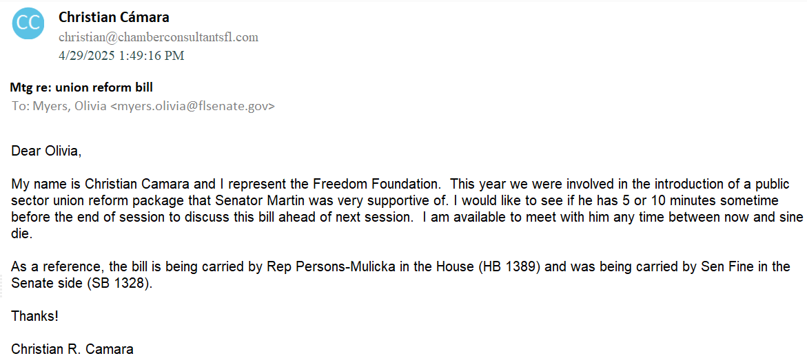 “My name is Christian Camara and I represent the Freedom Foundation,” Camara, a lobbyist with Chamber Consultants LLC, wrote in an introductory email to Martin’s legislative aide on April 29, 2025, about a month after Camara similarly appealed to Sen. McClain, who “respectfully declined” the Freedom Foundation’s request for him to cosponsor their bill.